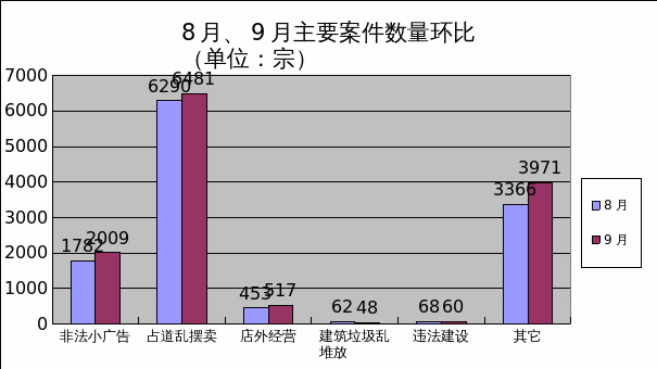 (二)部分类型案件结案率较低。9月,施工管理类案件115宗,结案率为86.96%,突发事件类案件61宗,结案率为86.89%。各区城管部门应加强管理,提高案件办理效率。各区城管部门应做好疏导管理工作。