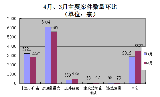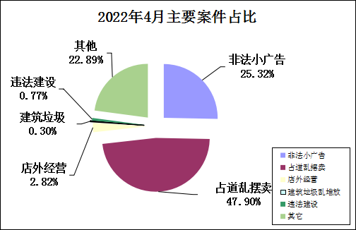 (一)流动摊贩、占道经营现象较多,环境问题突出。通过4月主要案件占比图表显示,流动摊贩和占道经营现象比较突出且总体有上升趋势,蓬江区、新会区、鹤山市商铺、流动小贩占道经营多发,建议加强巡查并采取有效措施,各县(市、区)城管部门应做好疏导管理工作,并督促市场管理单位落实责任区责任制。