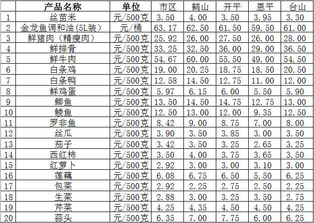 说明:1、表中价格为该地区监测点综合平均价;2、“市区”含蓬江区、江海区、新会区,价格分别采自蓬江市场、江南市场、城东市场等6家农贸市场;3、其他四个县市价格分别采自新鹤市场、锦江市场等8家农贸市场。