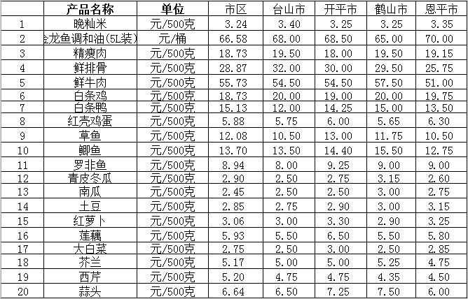 说明:1、表中价格为该地区监测点综合平均价;2、“市区”含蓬江区、江海区、新会区,价格分别采自蓬江市场、江南市场、城东市场等13家农贸市场;3、其他四个县市价格分别采自新鹤市场、锦江市场等8家农贸市场。