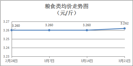 粮食类价格稳中略涨。本周所监测的6种粮食商品均价为3.262元/斤,环比(与上周比,下同)上涨0.05%。其中:晚籼米、珍珠米零售均价分别为每斤3.28元、3.08元,环比均持平。