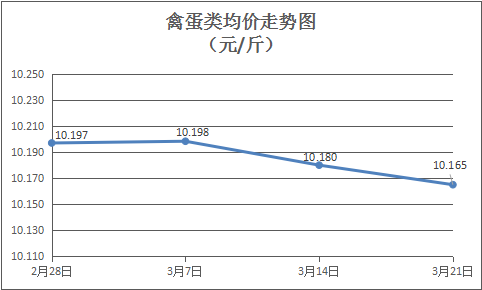 禽蛋类商品价格微幅波动。本周所监测的6种禽蛋类商品均价为10.165元/斤,环比下降0.15%。其中:白条鸡、白条鸭零售均价分别为每斤19.28元、14.31元,环比分别下降0.57%、上涨0.21%;红壳鸡蛋、鸭蛋零售均价分别为每斤5.91元、7.13元,环比上涨0.34%、上涨0.28%。