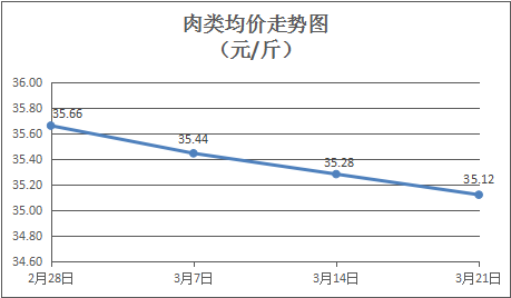 肉类商品价格小幅下降。本周所监测的8种肉类商品均价为35.12元/斤,环比下降0.45%。其中:排骨、精瘦肉、牛肉、带骨羊肉零售均价分别为每斤29.12元、18.91元、54.96元、47.29元,环比分别下降1.05%、下降2.07%、下降0.09%、下降0.27%。