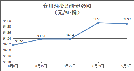 食用油类商品价格稳定。本周所监测的9种食用油(5L装)商品价格稳定,综合零售均价为94.59元/桶,环比持平。其中:菜籽油、金龙鱼调和油5L装零售均价分别为每桶72.92元、69.39元,环比均持平。