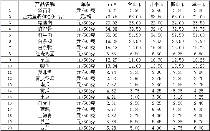 说明:1、表中价格为该地区监测点综合平均价;2、“市区”含蓬江区、江海区、新会区,价格分别采自蓬江市场、江南市场、城东市场等13家农贸市场;3、其他四个县市价格分别采自新鹤市场、锦江市场等8家农贸市场。