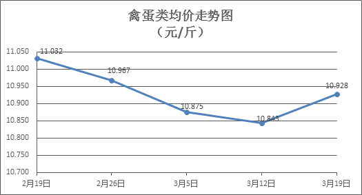 禽蛋类商品价格总体略升。本周所监测的6种禽蛋类商品价格波动情况为5涨1跌,综合零售均价为10.928元/斤,环比上涨0.78%。其中:白条鸡、白条鸭零售均价分别为每斤19.72元、15.27元,环比分别上涨0.36%、上涨1.60%;白壳鸡蛋、鸭蛋零售均价分别为每斤6.93元、7.84元,环比分别下降1.28%、上涨1.29%。