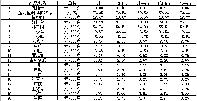 说明:1、表中价格为该地区监测点综合平均价;2、“市区”含蓬江区、江海区、新会区,价格分别采自蓬江市场、江南市场、城东市场等13家农贸市场;3、其他四个县市价格分别采自新华市场、锦江市场等8家农贸市场。