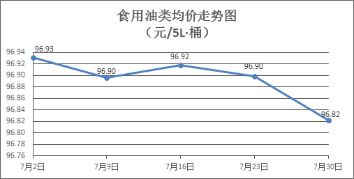 食用油类商品价格总体略降。上周所监测的9种食用油(5L装)商品价格波动情况为1涨4跌4平,综合零售均价为96.82元/桶,环比下降0.08%。其中:金龙鱼花生油、金龙鱼调和油零售均价分别为每桶105.41元、71.07元,环比分别下降0.27%、持平。