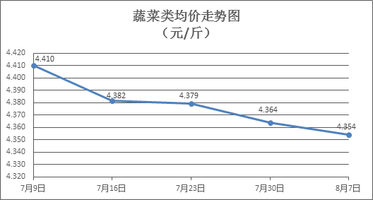据本市21家农贸市场监测数据显示,上周(7月31日至8月6日,下同)市场上各类“菜篮子”商品供应充足,所监测的7大类“菜篮子”商品价格1涨6跌。其中:粮食类商品价格基本平稳,食用油类、水果类、水产类商品价格总体略降,肉禽蛋类、蔬菜类价格升降互现。受饲料价格上涨影响,预计近期部分禽蛋类商品价格跟涨,其他商品价格小幅波动。