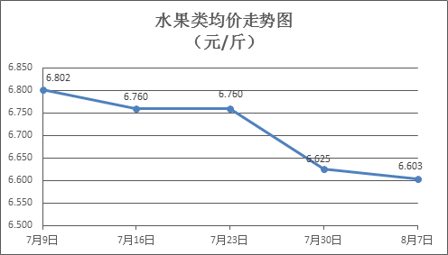 水果类商品价格微幅下降。上周所监测的6种水果商品价格波动情况为2涨4跌,综合零售均价为6.603元/斤,下降0.33%。其中橙子、苹果、梨零售均价分别为每斤6.26元、7.43元、6.66元,环比分别上涨0.16%、下降0.13%、下降0.15%。