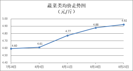 蔬菜类商品价格总体略涨。所监测的32 种蔬菜商品价格波动情况为22涨9跌1平,综合零售均价为每斤4.92元,环比上涨0.88%。其中:涨幅居前的品种包括莴笋、西红柿、青豆角,零售均价分别为每斤5.30元、5.06元、5.81元,环比分别上涨7.94%、5.86%、5.25%;跌幅靠前的品种包括黄瓜、丝瓜、苦瓜,零售均价分别为每斤4.46元、4.76元、5.19元,环比分别下降5.71%、5.37%、3.35%。