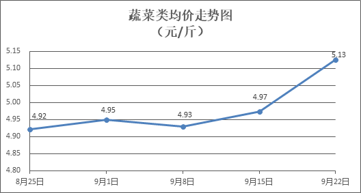 蔬菜类商品价格整体上涨。所监测的32 种蔬菜商品价格波动情况为28涨3跌1平,综合零售均价为每斤5.13元,环比上涨3.07%。其中:涨幅居前的品种包括本地菜心、西洋菜、花菜,零售均价分别为每斤6.14元、6.46元、5.95元,环比分别上涨13.91%、8.21%、8.18%;跌幅靠前的品种包括黄瓜、莲藕、奶白菜,零售均价分别为每斤4.34元、5.53元、5.38元,环比分别下降2.25%、1.07%、0.37%。