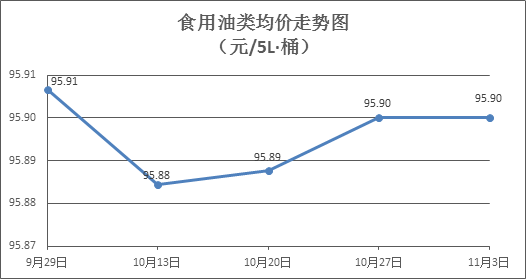 食用油类商品价格平稳。所监测的9种食用油(5L装)商品价格均持平,综合零售均价为每桶95.90元,环比持平。其中:金龙鱼花生油、金龙鱼调和油零售均价为每桶102.81元、71.29元,环比均持平。