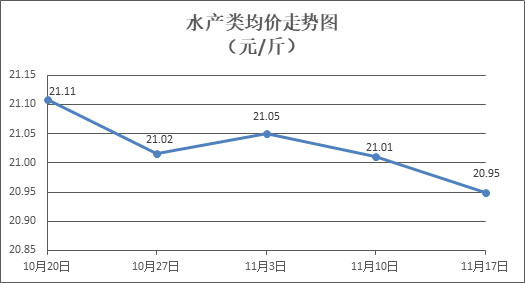 水产类商品价格主降。所监测的9种水产商品价格波动情况为1涨5跌3平,综合均价为每斤20.95元,环比下降0.30%。其中:草鱼、鲫鱼、罗非鱼、基围虾零售均价分别为每斤11.03元、13.91元、9.02元、29.88元,环比分别下降0.36%、持平、下降0.22%、下降0.07%。