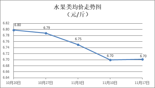 水果类商品价格升降互现。所监测的6种水果商品价格波动情况为2涨3跌1平,综合零售均价为每斤6.70元,环比上涨0.02%。其中橙子、苹果、葡萄零售均价分别为每斤6.32元、7.43元、13.78元,环比分别下降1.56%、下降0.27%、上涨1.62%。