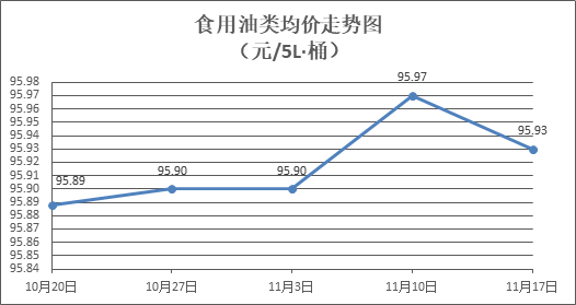 食用油类商品价格稳中有降。所监测的9种食用油(5L装)商品价格波动情况为3跌6平,综合零售均价为每桶95.93元,环比下降0.04%。其中:金龙鱼花生油、金龙鱼调和油零售均价为每桶102.70元、71.21元,环比分别下降0.11%、持平。