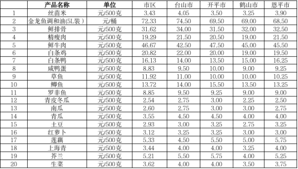 说明:1、表中价格为该地区监测点综合平均价;2、“市区”含蓬江区、江海区、新会区,价格分别采自蓬江市场、江南市场、城东市场等13家农贸市场;3、其他四个县市价格分别采自新华市场、锦江市场等8家农贸市场。