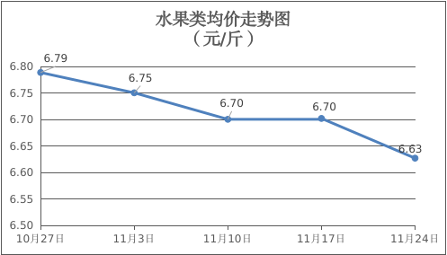水果类商品价格普遍下降。所监测的6种水果商品价格波动情况为1涨5跌,综合零售均价为每斤6.63元,环比下降1.12%。其中橙子、苹果、葡萄零售均价分别为每斤6.14元、7.42元、13.44元,环比分别下降2.85%、下降0.13%、下降2.47%。