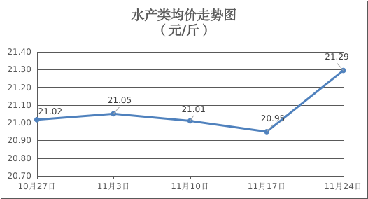 水产类商品价格升降互现。所监测的9种水产商品价格波动情况为2涨5跌2平,综合均价为每斤21.29元,环比上涨1.65%。其中:草鱼、鲫鱼、罗非鱼、海虾零售均价分别为每斤11.00元、13.91元、9.01元、51.70元,环比分别下降0.27%、持平、下降0.11%、上涨6.60%。