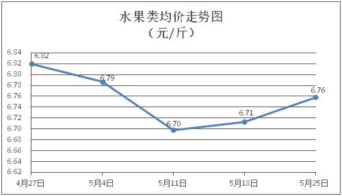 水果类商品价格普遍上涨。所监测的6种水果商品价格波动情况为4涨1跌1平,综合零售均价为每斤6.76元,环比上涨0.67%。其中橙子、香蕉、葡萄零售均价分别为每斤6.43元、3.42元、14.33元,环比分别上涨1.26%、上涨0.29%、上涨1.42%。