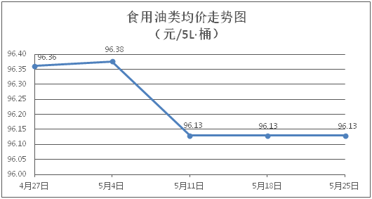 食用油类商品价格基本平稳。所监测的9种食用油(5L装)商品价格波动情况为1涨1跌7平,综合零售均价为每桶96.13元,环比下降0.001%。其中:鲁花花生油、金龙鱼调和油零售均价为每桶156.36元、71.46元,环比分别下降0.03%、上涨0.04%。