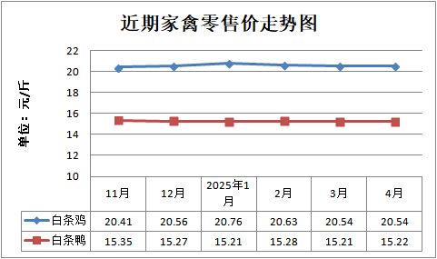 白条鸡、白条鸭零售均价分别为每斤20.54元、15.22元,环比分别持平、上涨0.07%,同比分别上涨2.70%、上涨2.49%;鸡蛋、咸鸭蛋零售均价分别为每斤6.64元、9.21元,环比分别上涨4.08%、上涨0.66%,同比分别上涨4.40%、上涨4.42%。