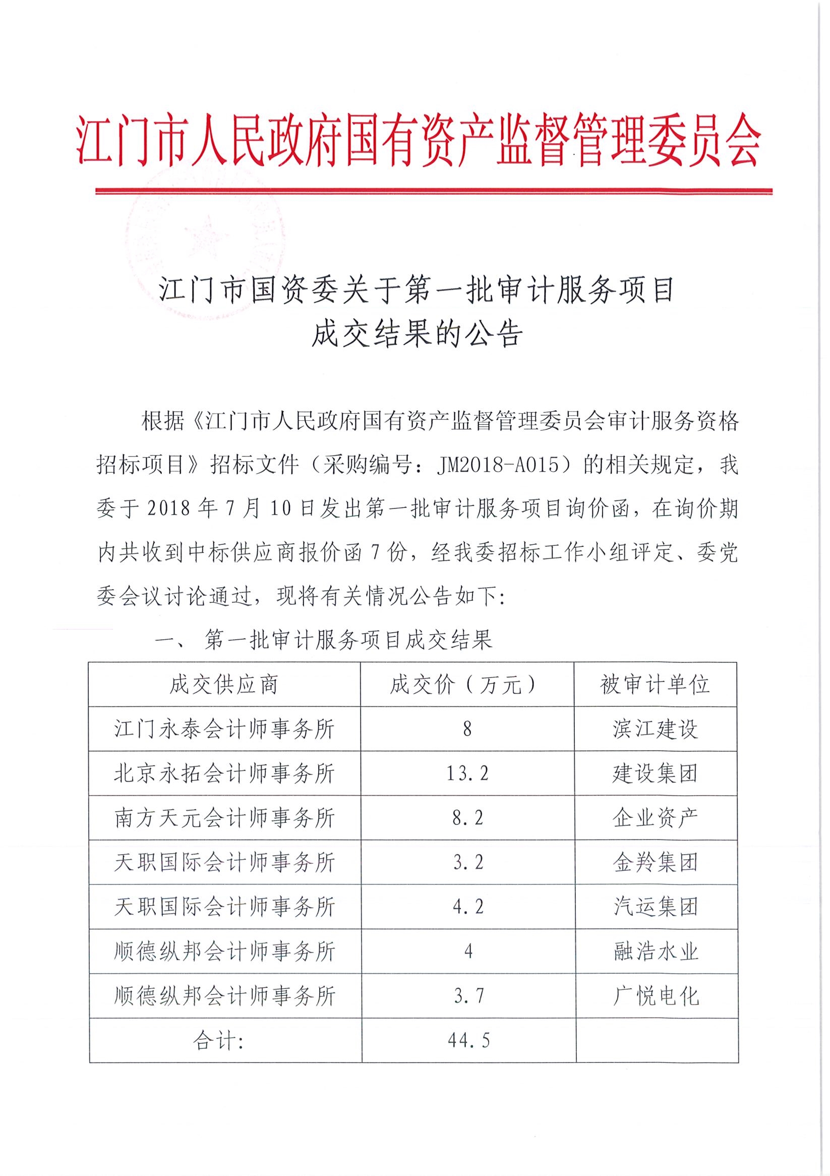 江门市国资委关于第一批审计服务项目 成交结果的公告