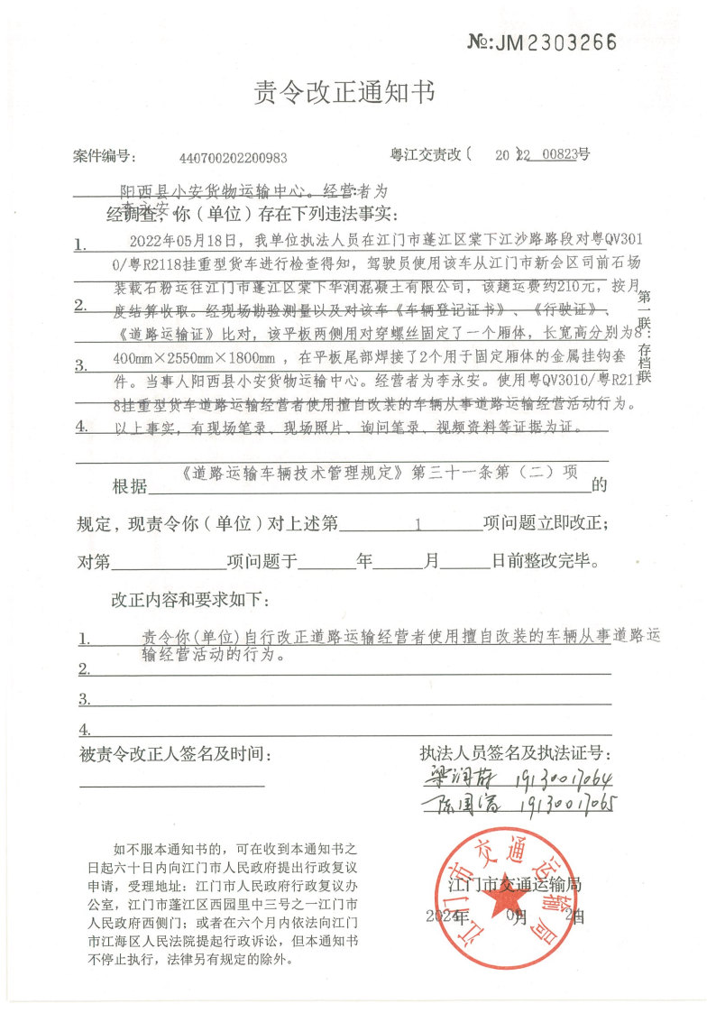你(单位)因违反交通运输行政管理法规,本机关已作出行政处罚决定和责令改正通知书(具体内容详见附件)。依照《中华人民共和国民事诉讼法》第九十五条的规定,因受送达人采用其他方式无法送达,现向你(单位)公告送达《行政处罚决定书》和《责令改正通知书》。自公告之日起,经过30日即视为送达。