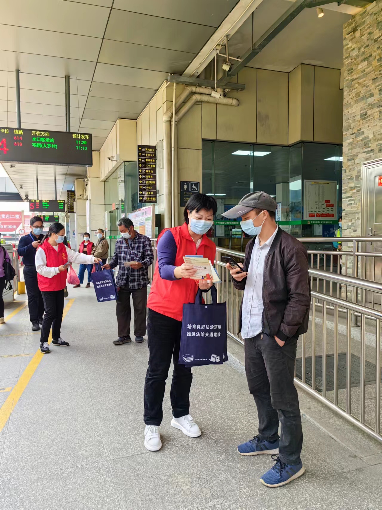 3月8日上午,组织开展“建设法治中国 交通巾帼在行动”普法活动。本次活动深入客运站场、公交站场等交通运输阵地,现场派发了宪法、民法典婚姻家庭编、民法典侵权责任编、《广东省农村公路条例》《江门市文明行为促进条例》等法律法规360多份,回应群众有关法律问题,努力使尊法学法守法用法在交通运输行业蔚然成风,让法治深入交通运输从业者、参与者心中。