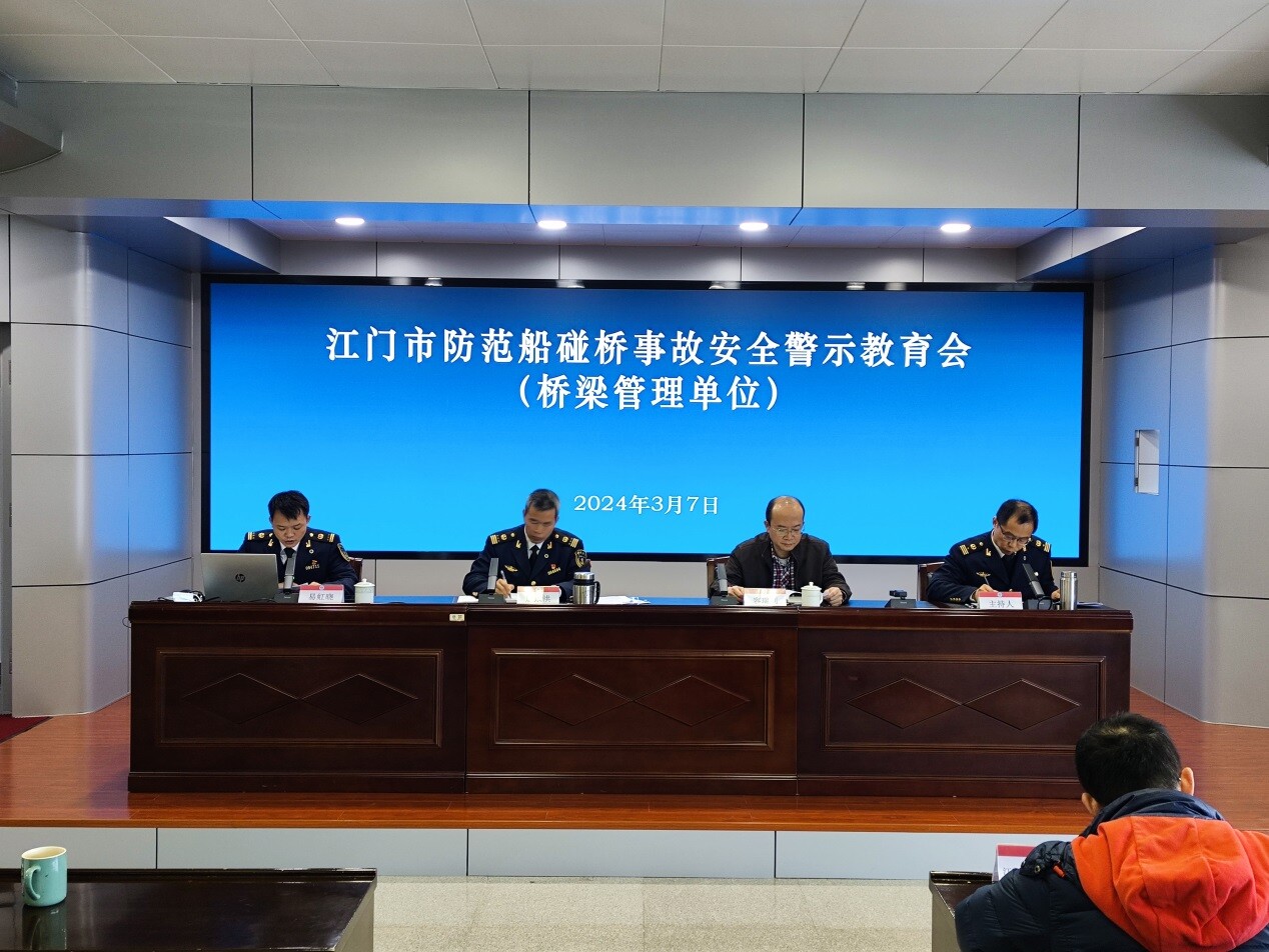 为深刻吸取事故教训,进一步加强防范船碰桥事故工作,3月7日上午,江门市交通运输局会同江门海事局召开全市桥梁业主单位防范船碰桥安全警示教育会,各级海事、交通、航道、公路等监督管理部门、江门辖区通航桥梁管养单位相关负责人共125人参加会议。
