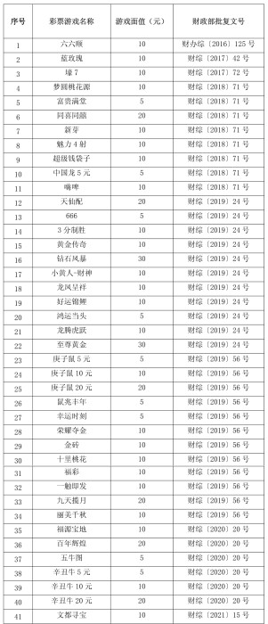 根据《财政部关于停止销售“六六顺”等41款即开型福利彩票游戏的审批意见》(财综〔2023〕36号)的要求,中国福利彩票发行管理中心决定: