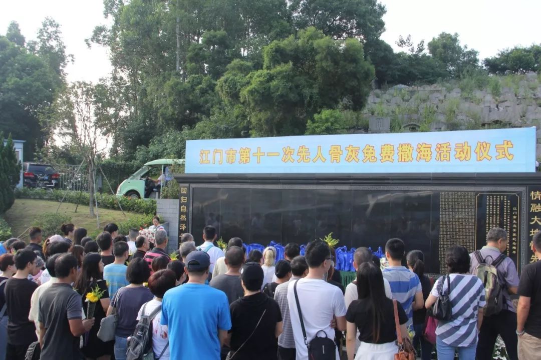 早上8时,参加海葬活动的 73个家庭的亲朋好友以及有关部门代表、媒体记者在江门市生态安葬纪念墙前举行了简短而隆重的第十一次免费海葬活动告别仪式,黄海见同志在讲话中指出,海葬先人骨灰是深化殡葬改革推行节地生态葬法的重要形式,是完成先人回归自然遗愿的可行途径。为更好地推广先人骨灰海葬活动,推动绿色生态葬法,我市建立了常态化机制,全年接受海葬活动报名及咨询,制定出台包括海葬在内的绿色生态葬法补贴政策,对符合条件的,每盅先人骨灰一次性补贴500元,并在全市所有9个经营性公墓的绿色生态葬法纪念设施上为参与生态葬法的先人镌刻芳名,供后人缅怀追思和精神寄托。经过多年的推广引导,市民逐渐接纳海葬先人骨灰的处理方式,今年,共有73盅先人骨灰参与此次海葬活动。仪式结束后,参加海葬活动的家庭代表以及有关部门代表、媒体记者一同前往新会区黄茅海域,家庭代表们将先人骨灰伴着鲜花撒向蓝色大海,缓缓飘散,融归自然。