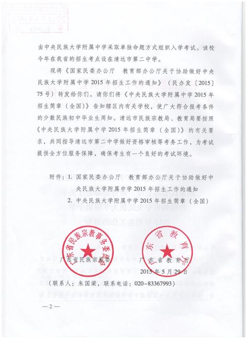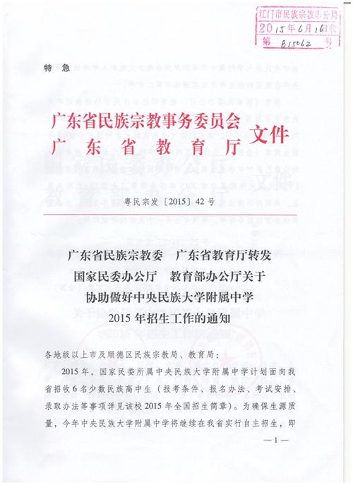 附件:《广东省民族宗教委 广东省教育厅转发国家民委办公厅 教育部办公厅关于协助做好中央民族大学附属中学2015年招生工作的通知》