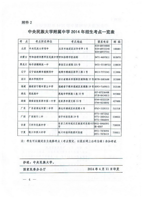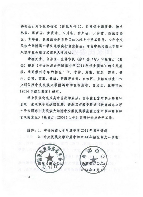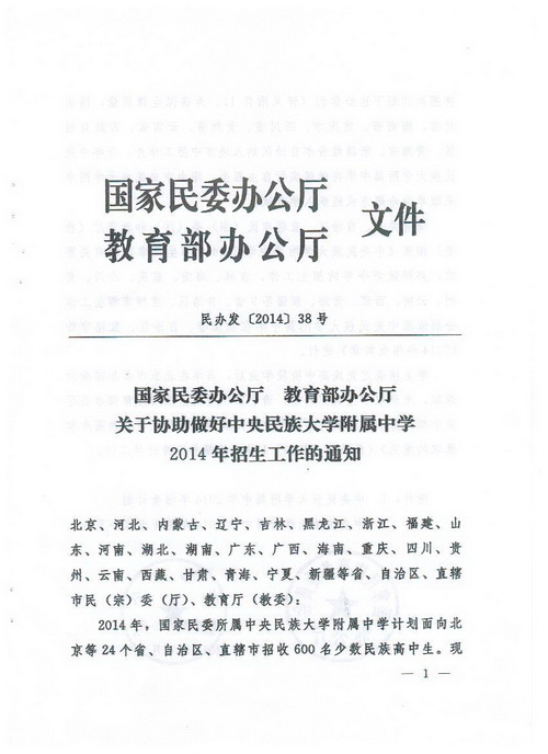 附件:1.国家民委办公厅 教育部办公厅关于协助做好中央民族大学附属中学2014年招生工作