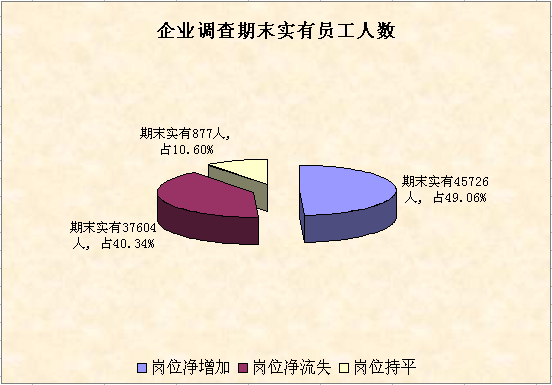 截至2019年第一季度末,全市450家用工定点监测企业实有在岗人数比上年第四季度有所增加,增幅为0.79%;第一季度新招人数比上季度增加2985人,增幅为68.97%,反映企业第一季度的用工需求有所扩大;第一季度流失人数多于新招人数,净流失1196人,比上季度增加851人,用工稳定性较上季度差。截至3月底,全市200家失业动态监测企业实有在岗总人数93207人,比上年12月建档期增加343人,反映企业节后经过员工返岗和新增招聘,用工总量得到有效补充。