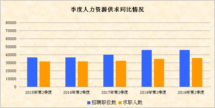 第二季度,从企业用工及人力资源服务平台信息系统和全市人力资源服务机构的数据统计,全市用人单位登记招聘职位数共45884个,登记求职人数共35930人,总体职位供求比为1:0.78(招聘职位数为1,求职人数为 0.78,下同);全市人力资源市场总体用工缺口为9954人。