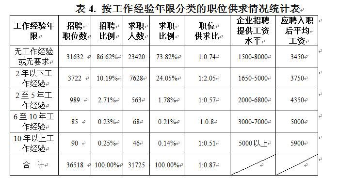 第二季度,全市用人单位在人力资源和社会保障网上服务平台上登记招聘职位数共36518个;登记求职人数共31725人;总体职位供求比为1:0.87(招聘职位数为1,求职人数为0.87,下同,详见表1)、免费食宿所占比例为20%;全市人力资源市场总体用工缺口为4793人。