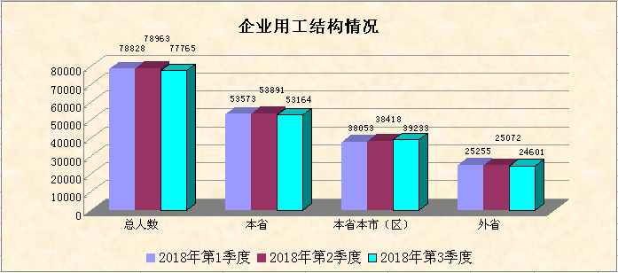 企业第三季度的在岗员工中,本省员工有53164人,占68.36%,环比减少1.35%;本省本市(区)员工有39233人,占总人数的50.45%,环比增加2.12%;外省员工有24601人,占31.64%,环比减少1.88%。反映企业用工主要以本市(区)员工为主,外省员工逐渐减少。1-3季度的企业用工结构没有出现大幅变动。
