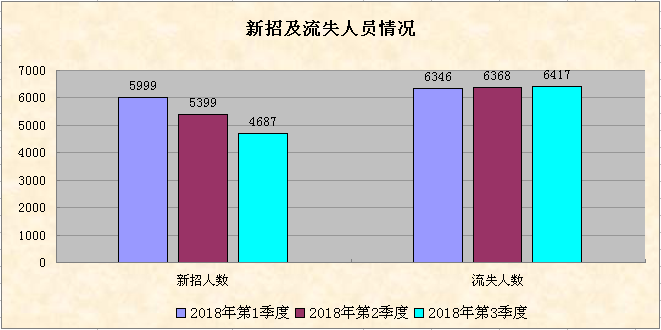 企业第三季度新招员工4687人,比上季度减少712人,环比减少13.19%;第三季度流失员工6417人,比上季度增加49人,环比增加0.77%;新招员工与流失员工的比值为0.73,比上季度的0.85减少了0.12,出现流失人数多于新招人数,净流失1730人,用工稳定性较上季度低。1-3季度企业新招人数逐季减少,反映企业用工需求得到一定程度的补充,但每季度流失人数有小幅增加,企业用工稳定性有待提高。