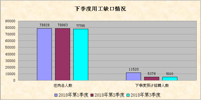 第三季度,从企业用工及人力资源服务平台信息系统和全市人力资源服务机构的数据统计,全市用人单位登记招聘职位数共35478个,登记求职人数共29681人,总体职位供求比为1:0.84(招聘职位数为1,求职人数为 0.84,下同);全市人力资源市场总体用工缺口为5797人。