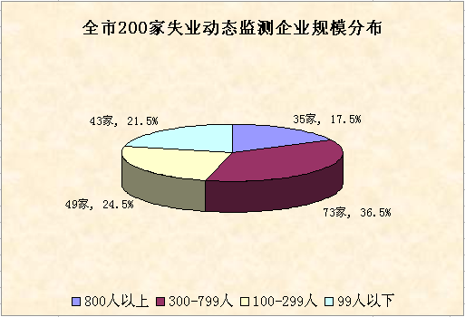 9月末全市失业动态监测共有200家企业,从监测企业规模结构来看,用工规模在800人以上的有35家,占17.5%;300至799人的有73家,占36.5%;100至299人的有49家,占24.5%;99人以下的有43家,占21.5%。
