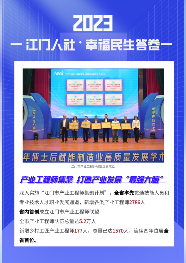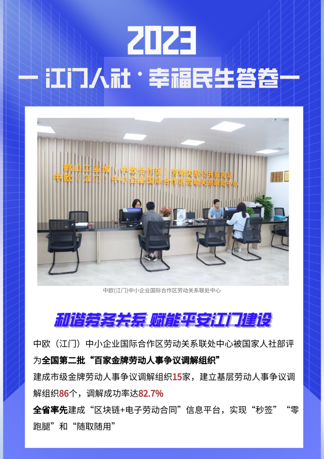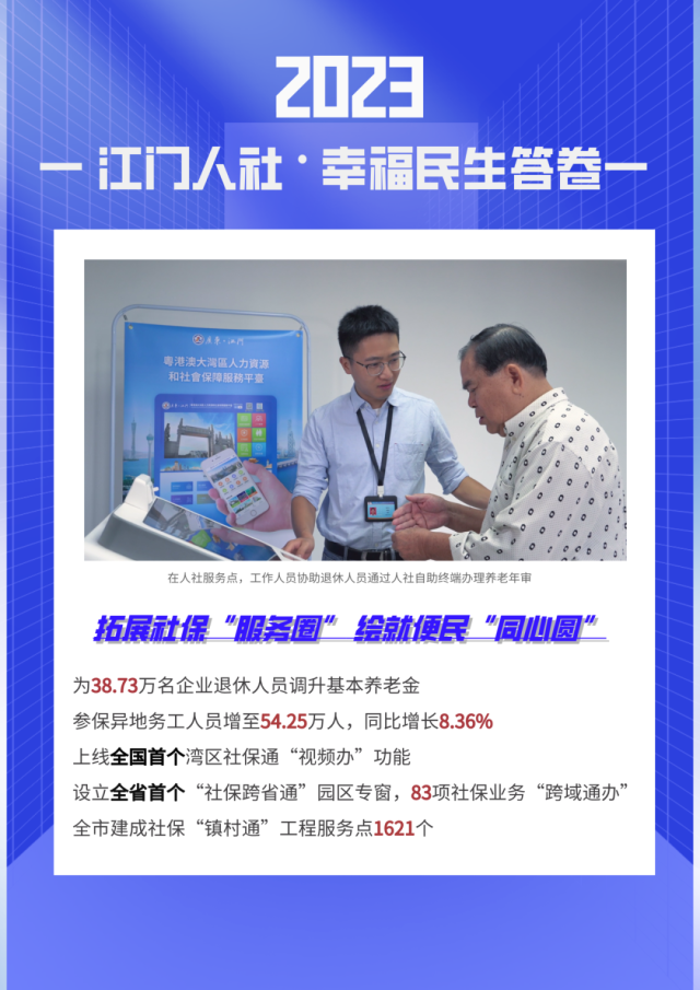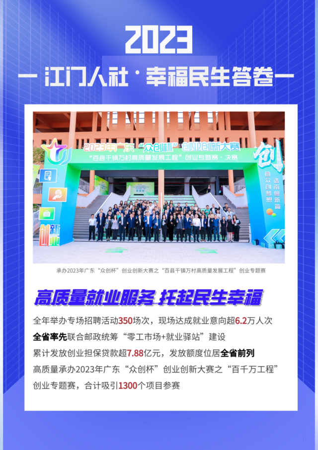 2023年来,江门市人力资源和社会保障局认真贯彻落实省委“1310”具体部署和市委“1+6+3”工作安排,坚持以人民为中心的发展思想,聚焦事关企业和群众切身利益的就业、社保、收入分配、劳动关系、人事人才等问题,不断加大惠企利民工作力度,推动各项工作取得新突破、新成效,交出了一份份硕果累累的答卷。