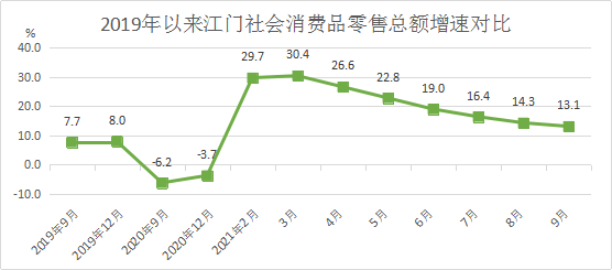 前三季度,全市实现社会消费品零售总额955.41亿元,同比增长13.1%;比2019年同期增长6.1%,两年平均增长3.0%。按经营单位所在地分,城镇消费品零售额743.40亿元,同比增长15.0%;乡村消费品零售额212.01亿元,同比增长6.8%。按消费类型分,限额以上商品零售额同比增长19.0%;限额以上餐费收入同比增长25.9%。