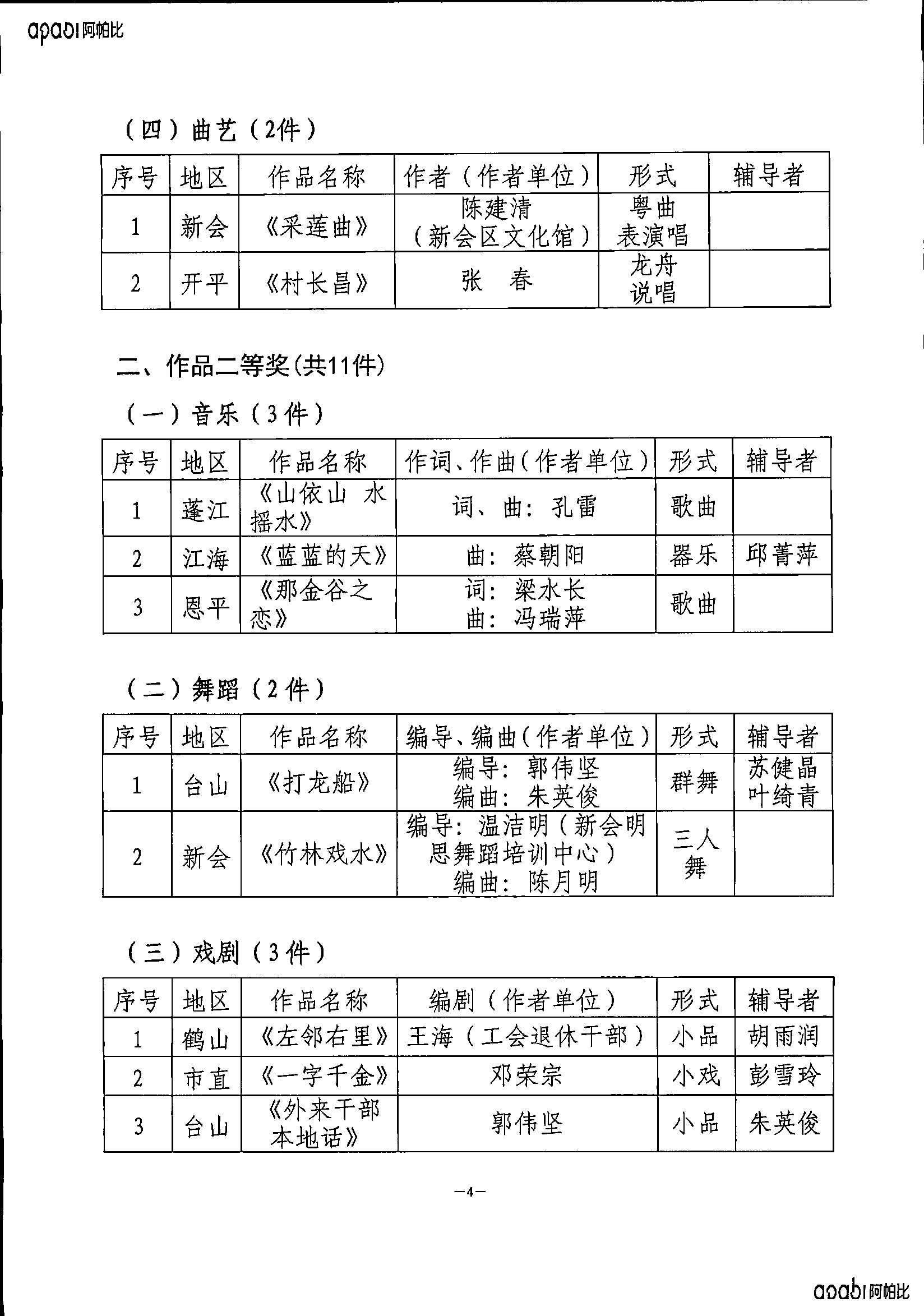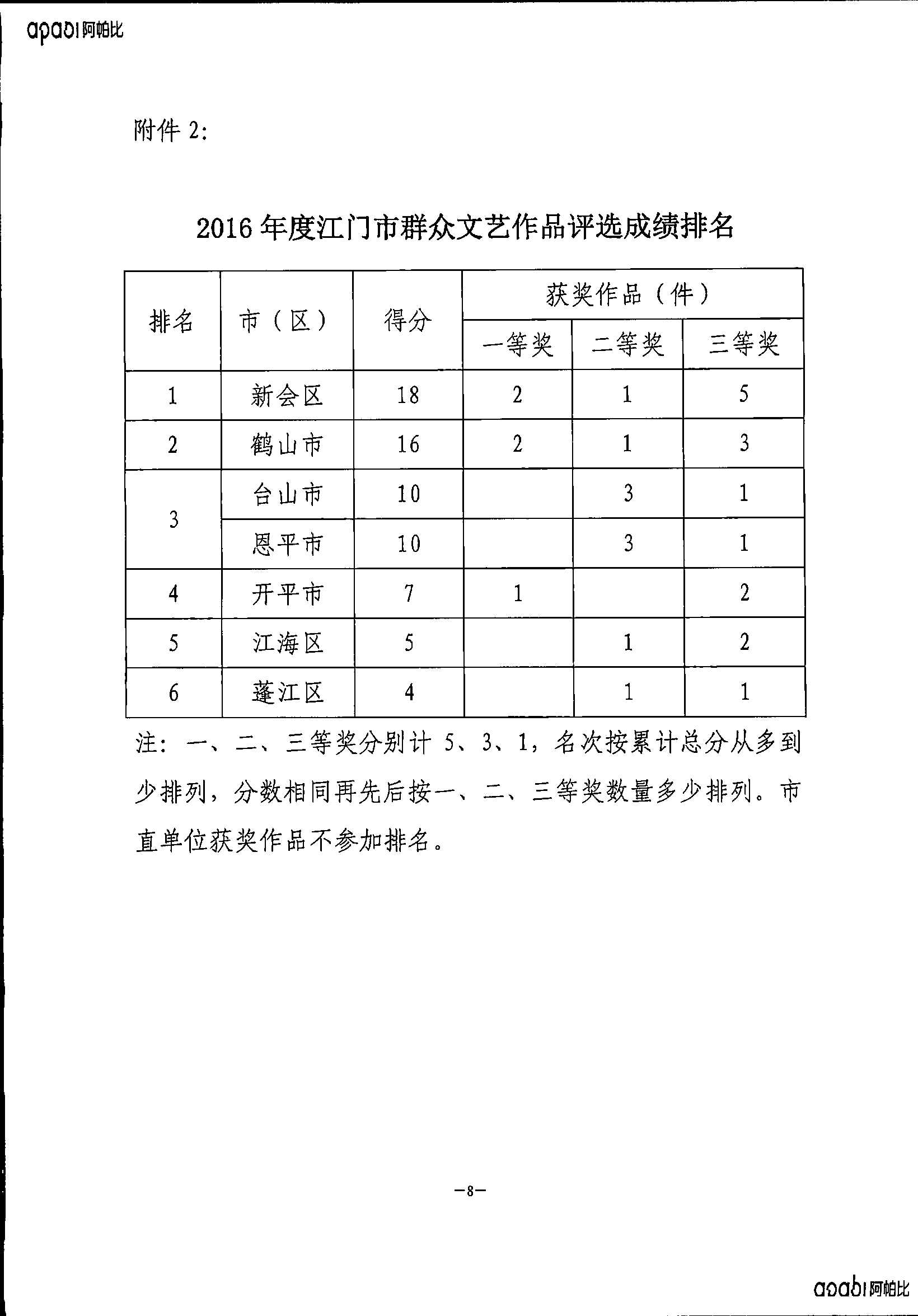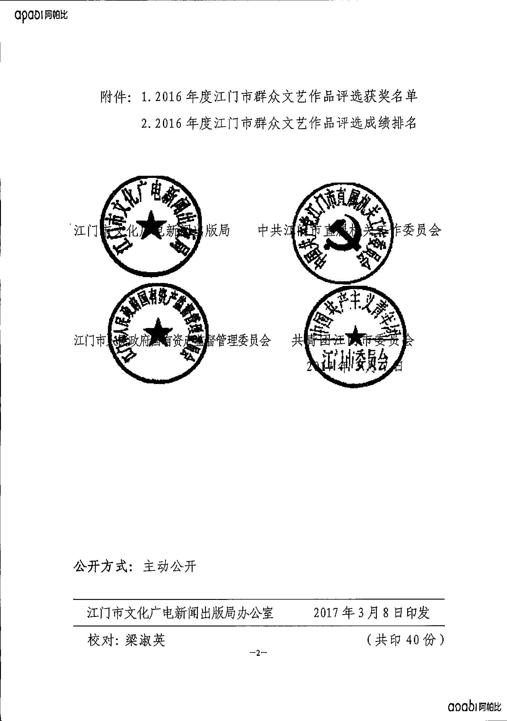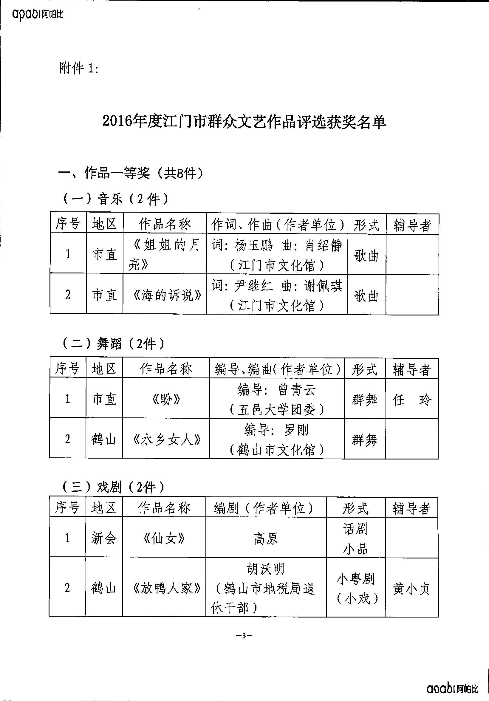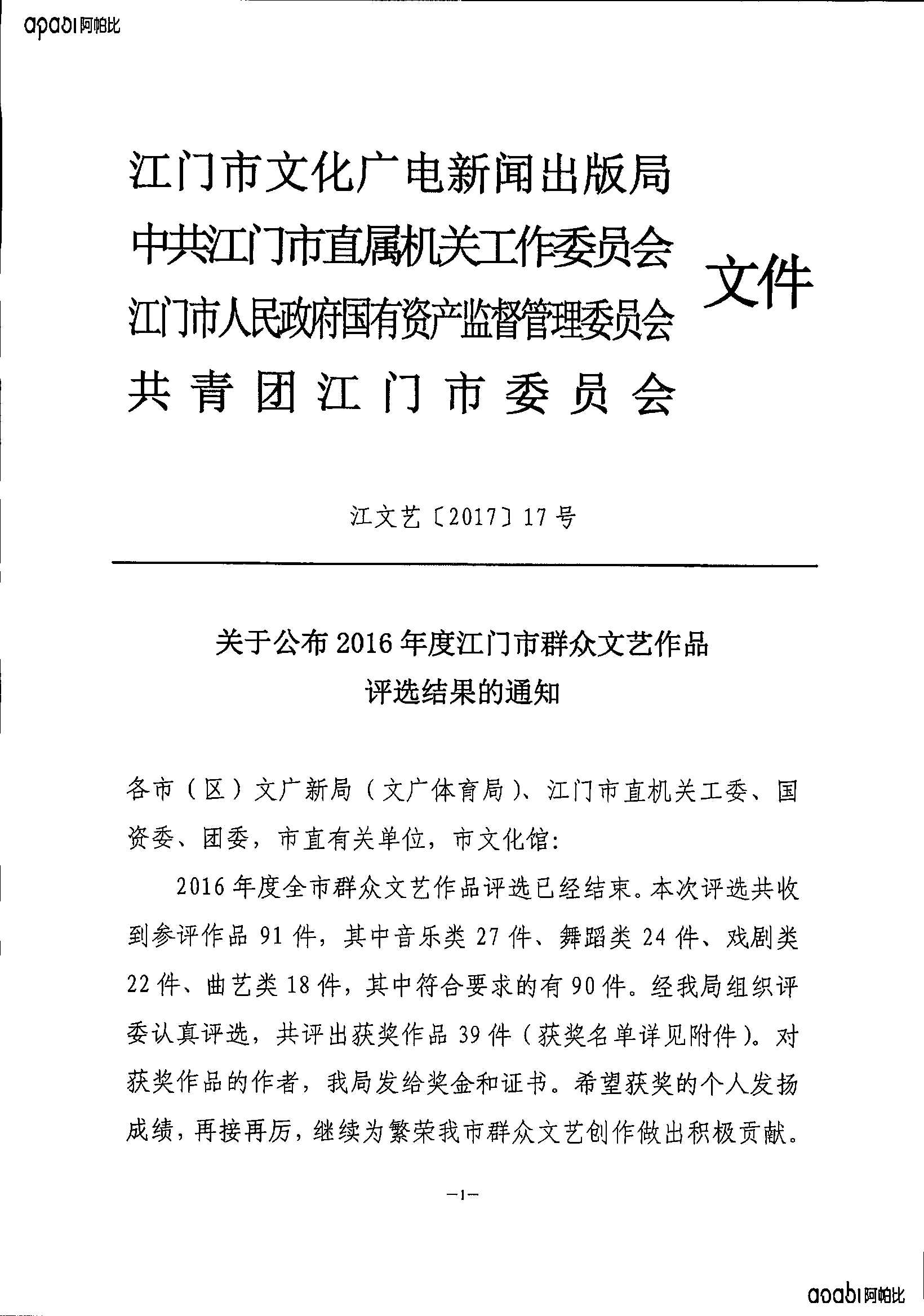 【文件】关于公布2016年度江门市群众文艺作品评选结果的通知(江文艺〔2017〕17号)