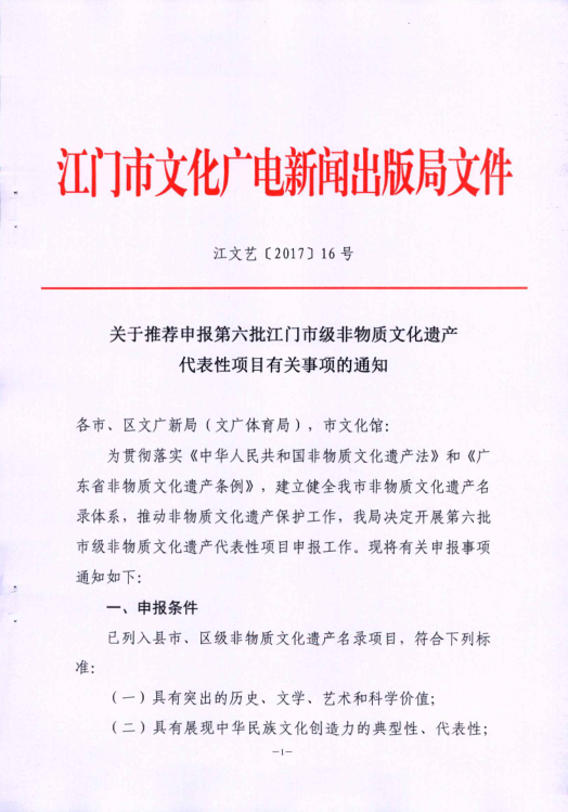 【文件】关于推荐申报第六批江门市级非物质文化遗产代表性项目有关事项的通知(江文艺〔2017〕16号)