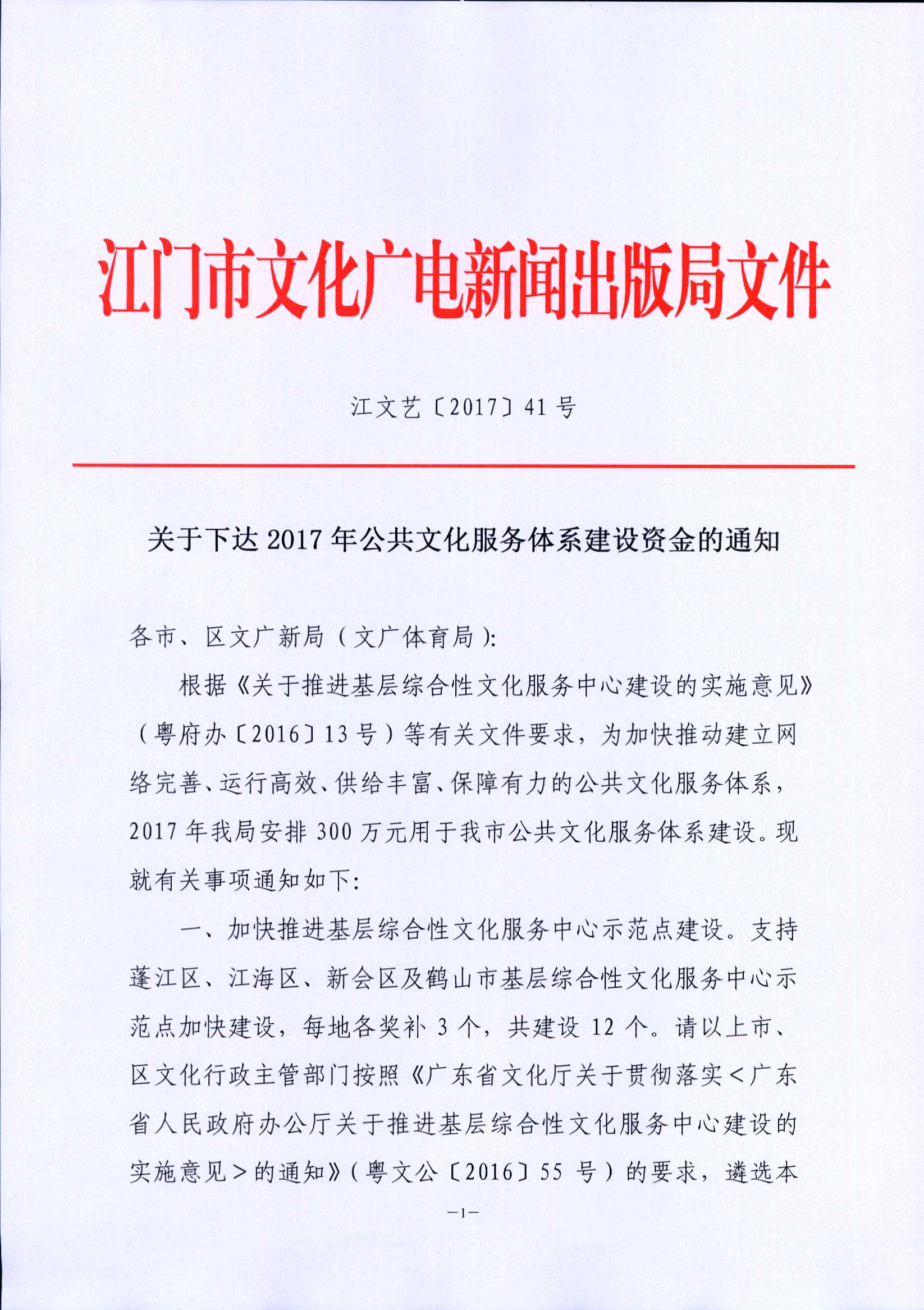 【文件】关于下达2017年公共文化服务体系建设资金的通知(江文艺〔2017〕41号)