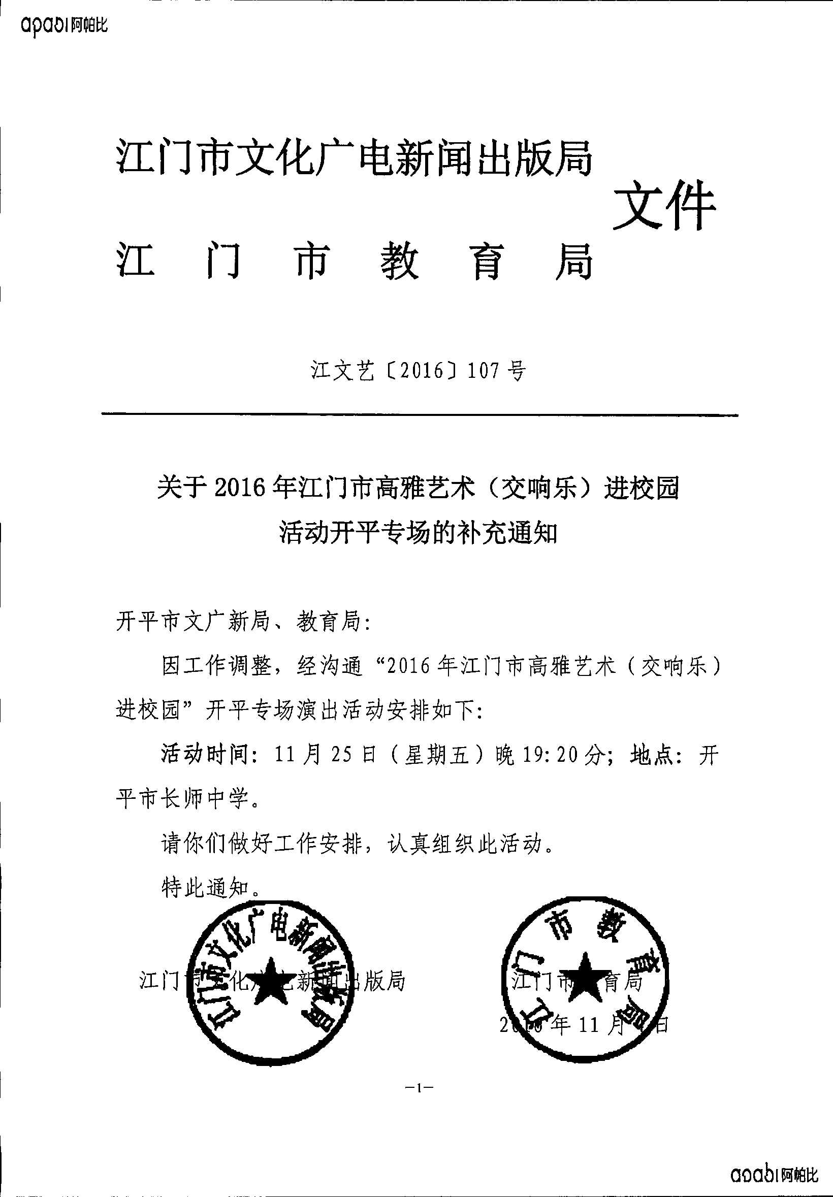 【文件】关于2016年江门市高雅艺术(交响乐)进校园 活动开平专场的补充通知(江文艺〔2016〕107号)