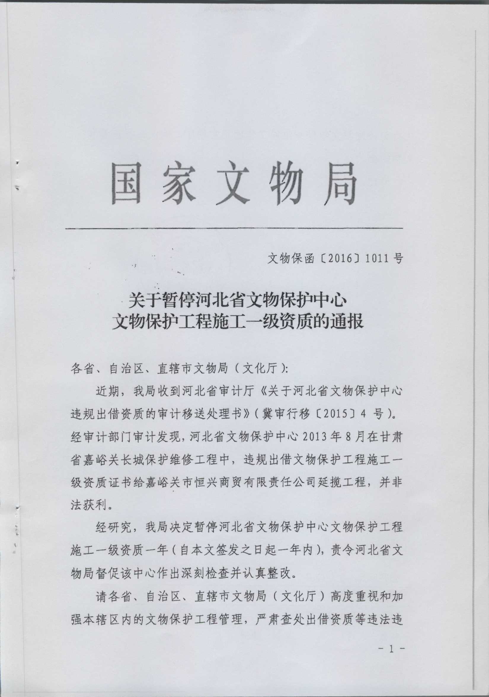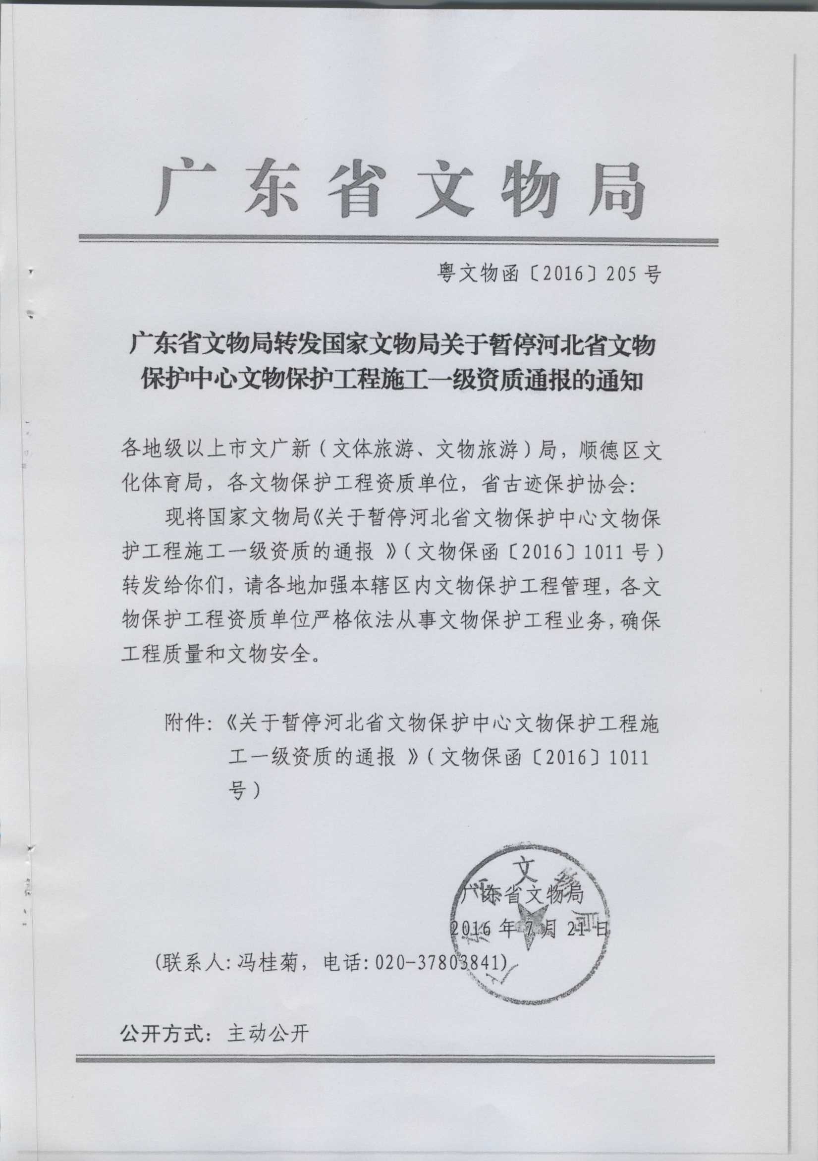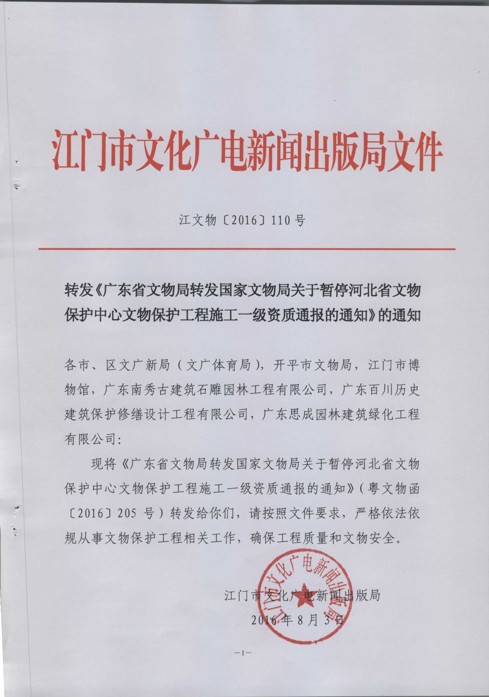 【文件】转发《广东省文物局转发国家文物局关于暂停河北省文物保护中心文物保护工程施工一级资质通报的通知》的通知(江文物〔2016〕110号)