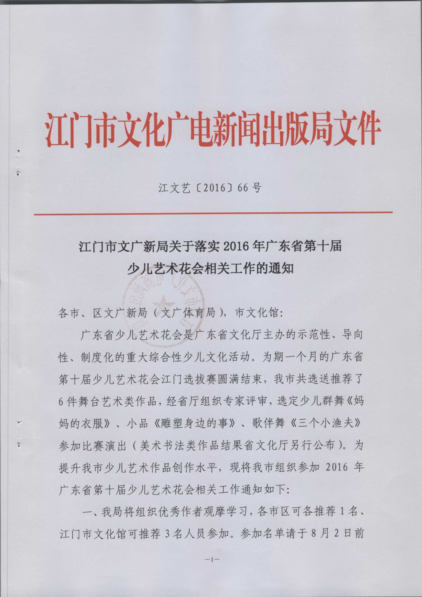 【文件】江门市文广新局关于落实2016年广东省第十届少儿艺术花会相关工作的通知(江文艺〔2016〕66号)