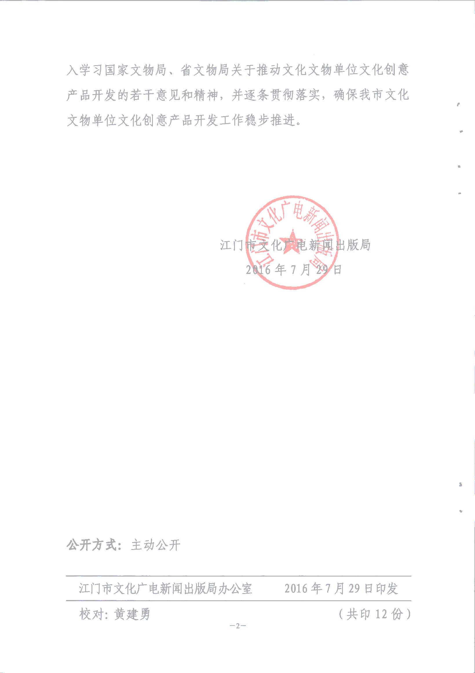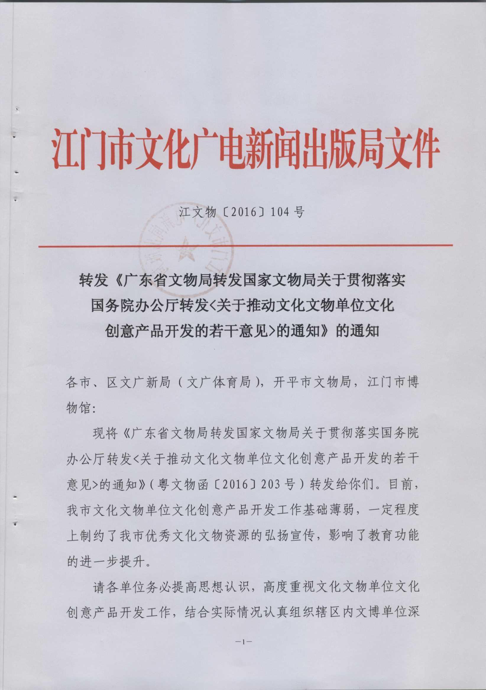 【文件】转发《广东省文物局转发国家文物局关于贯彻落实国务院办公厅转发<关于推动文化文物单位文化创意产品开发的若干意见>的通知》的通知(江文物〔2016〕104号)